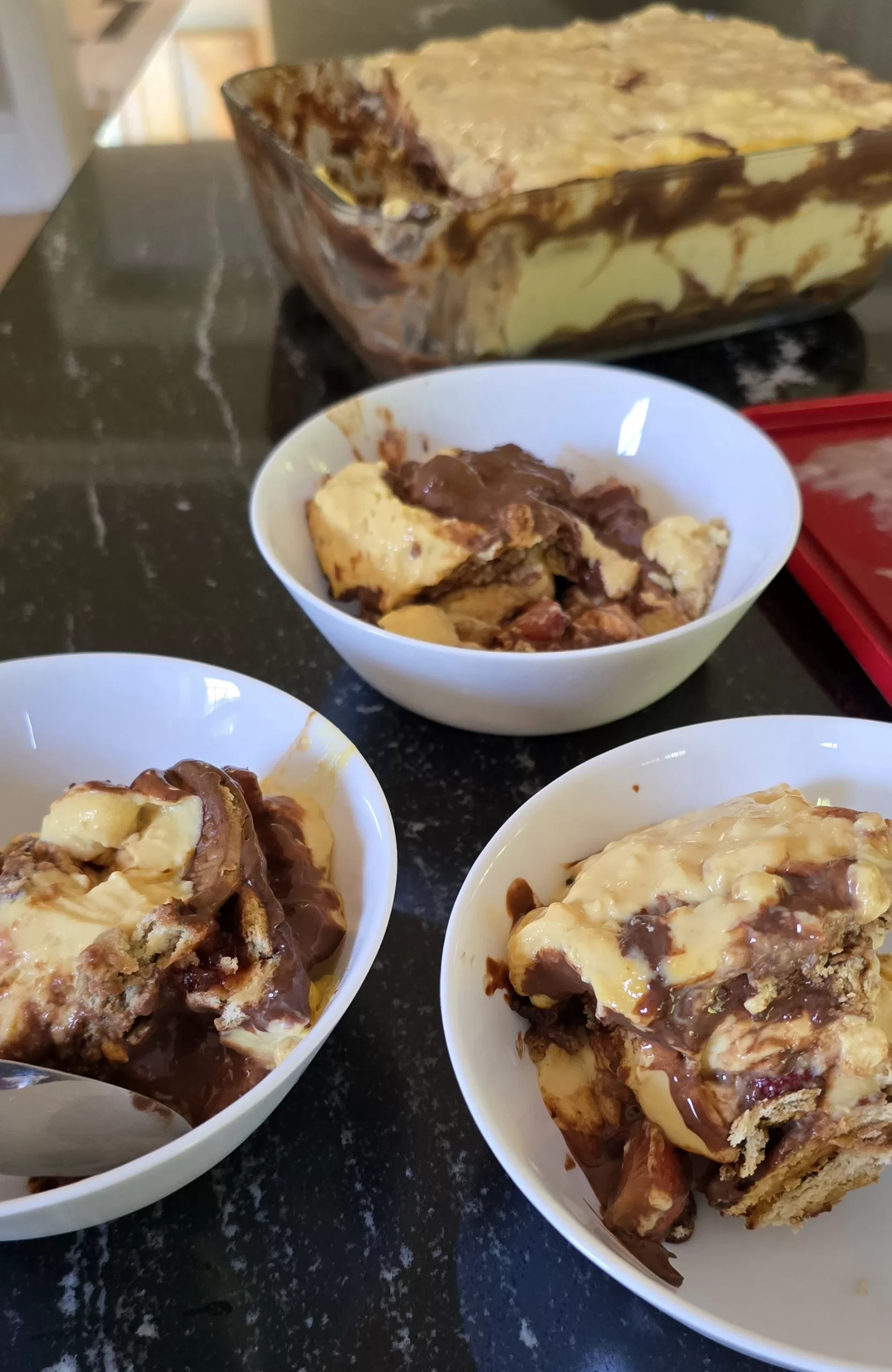 My friend did ask me to increase the chocolate sauce compared to the vanilla custard in the recipe. That’s just her quirk (being highly partial towards chocolate). I personally think that would make it v rich and indulgent. This is more balanced, homelier and easier to digest.